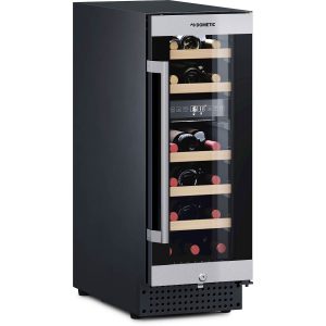 Kompressordrevet vinkøler fra Dometic med plads til 18 flasker på 5 udtrækbare træhylder.