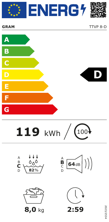 Gram tørretumbler med en kapacitet på 8 kg og 15 programmer. Læs hele beskrivelsen