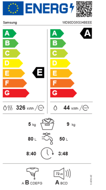 Samsung WD90DG5G34BEEE samler vask og tørring i ét slankt kabinet, så du får 9 kg vask og 5 kg tørring uden at fylde unødigt i rummet. Den slanke dybde på omkring 48 cm (ca. 56 cm inkl. front) gør den let at placere, mens 1400 omdrejninger og støjemissionsklasse A sikrer effektiv, mere rolig centrifugering.